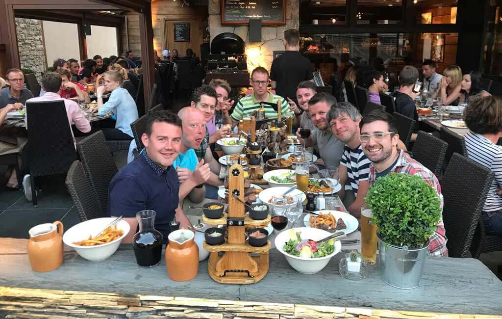 Sunday was our last day in Morzine before our flights back early on Monday. We were all struggling to even walk but wanted to see some sights. So, after breakfast at the chalet we took a ride up the Pleney bubble which gave us great views over most of the Spartan Race course – including the chain obstacle myself & Mike had epically failed. This meant we were going back to do it or we’d never live it down. We walked over the nursey slopes in awe of the imposing Nyon mountain we’d climbed, enjoying a drink at Le Vaffieu Restaurant in front of Mont Blanc (an amazing spot). We then walked back to the chain obstacle, where everyone laughed their heads off as myself & Mike took it on second time around. We headed back down to Morzine before getting a lift to stunning Lake Montriond, where we spent a top afternoon chilling in the sun, swimming, eating and drinking. Bliss. Back at the chalet we jumped in the hot tub before going out to eat at Morzine’s famous L’Etale restaurant. In true Spartan style, we kept things simple and ordered 8 x meat trees (La Potence), which basically means unlimited beef, chips and salad. All washed down with a few beers and a carafe or three of red wine. It was perfect. Afterwards the lads forced me to do the net obstacle I’d missed outside the tourist office. Maybe not the best idea in the dark at 11pm, but I made it. We hit the trendy Morzine nightlife, supping cocktails at Le Crepu and Cavern before rolling into bed at just before 3 and were up at 06:30 for our transfer. This is what Spartans are made of!